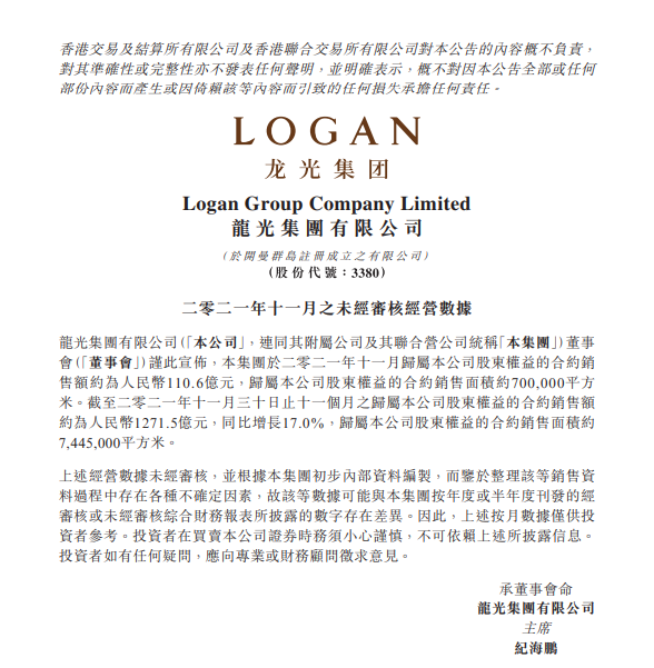 【环球网房产报道】12月13日,龙光集团(03380.HK)发布2021年11月未经审核销售数据。