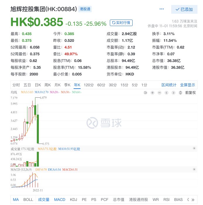 当日旭辉股票复盘,开盘后股价便整体下挫,盘中最低下探至0.375港元,系上市以来的最低值;早间收报0.385港元,跌25.96%,半日总市值蒸发约12.75亿港元。