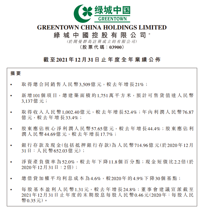 【环球网房产报道】3月22日,绿城中国控股有限公司(03900.HK)发布2021年全年业绩报告。
