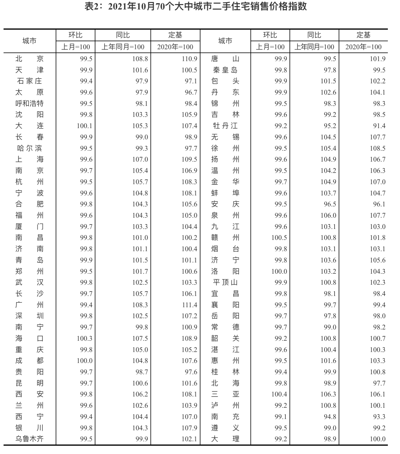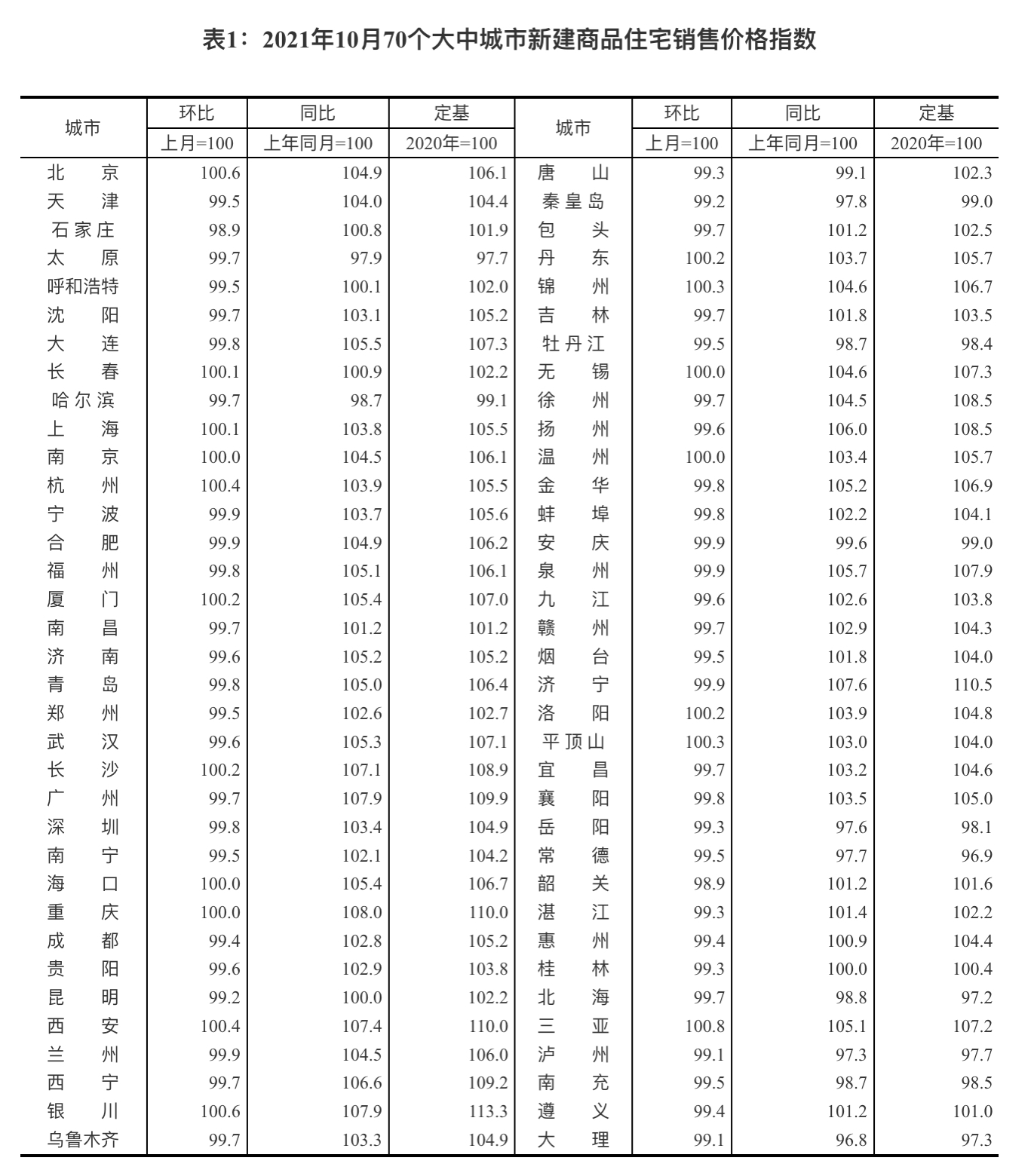 国家统计局城市司首席统计师绳国庆解读称,2021年10月份,70个大中城市商品住宅销售价格环比总体延续略降态势,同比涨幅继续回落。