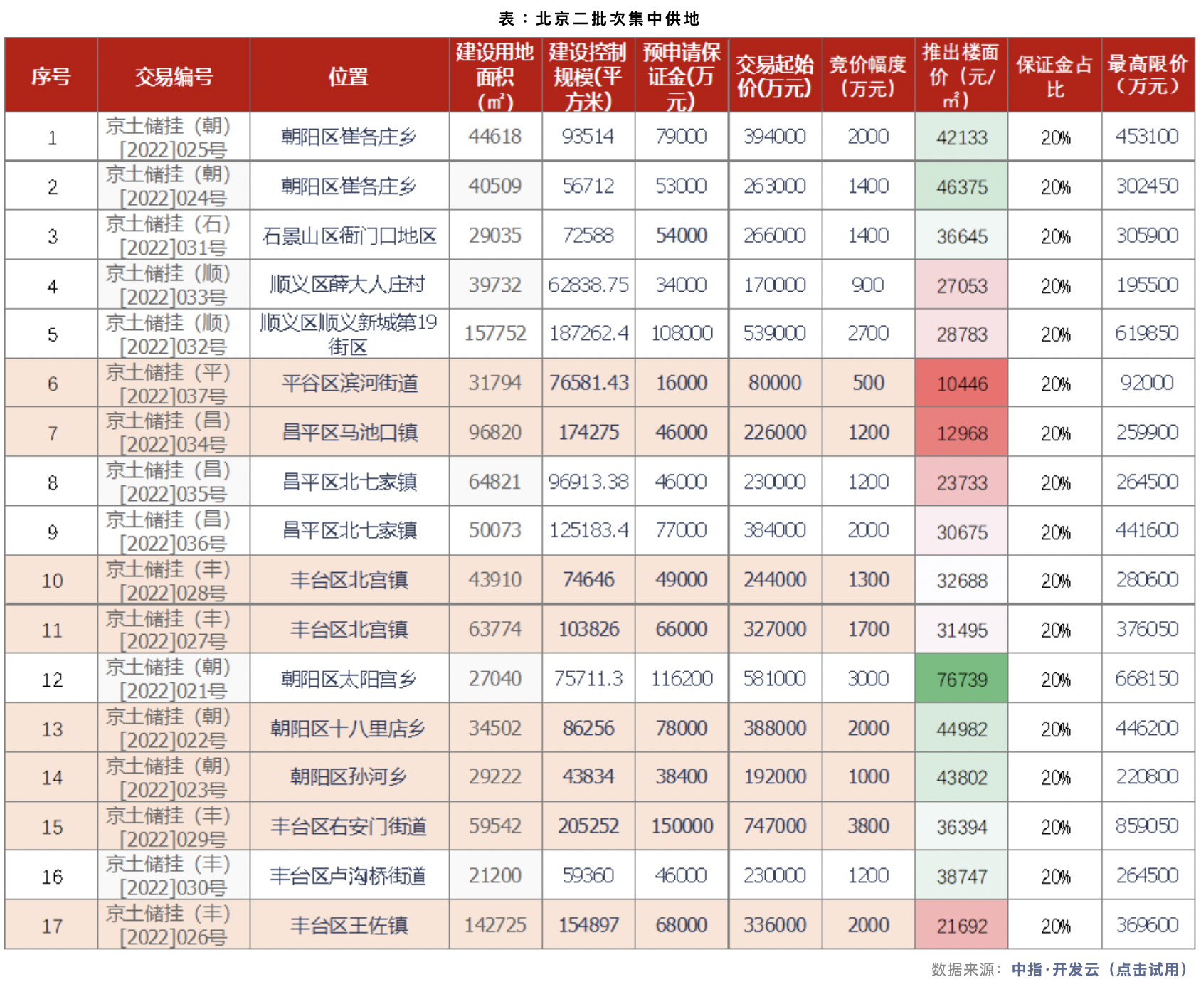 4月19日,北京市规划和自然资源委员会挂牌第二批集中供应的宅地,共计17幅,建设用地面积97.7万平方米,起始总价559.7亿元,总规划建筑规模约175万平方米。挂牌竞价起始时间为2022年5月10日,挂牌竞价截止时间为2022年5月24日。与一批次集中出让18幅、规划建面169.5万平米、出让金491.8亿元相比,两批次基本持平,供应土地规模相对稳定。