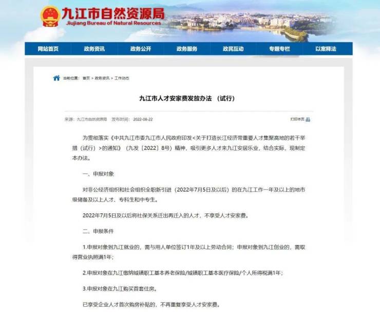 8月22日,据江西省九江市自然资源局官网,九江市发布《九江市人才安家费发放办法(试行)》(简称《办法》)。
