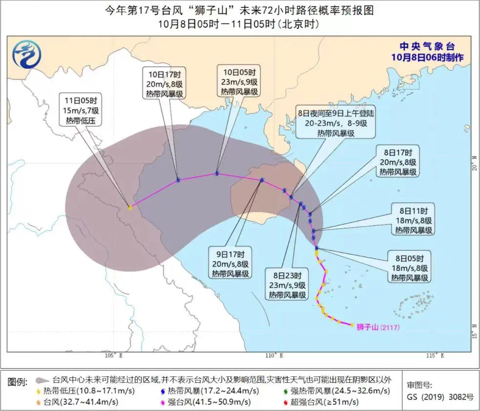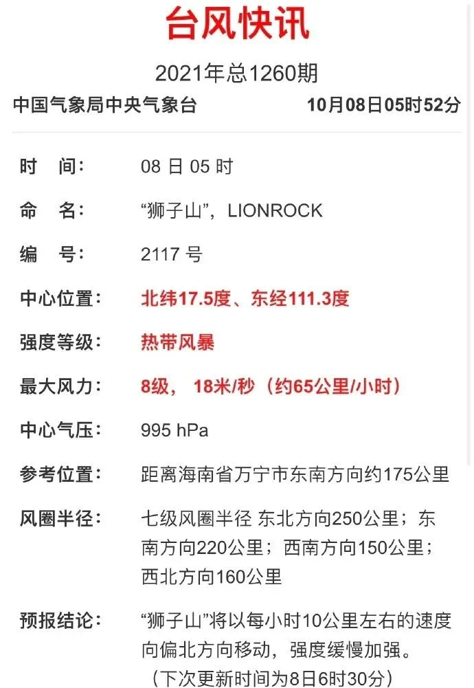 今天起床是不是很凉快? 上班时是不是很大风,感受到了秋天的到来? 那是因为,有台风啦~ 10月8日早上05时 南海热带低压加强为今年第17号台风“狮子山” 07时中心距离海南万宁东南方向约165公里 据阳江市气象台2021年10月8日07时发布的消息,预计,“狮子山”未来趋向海南岛东部海面,强度缓慢