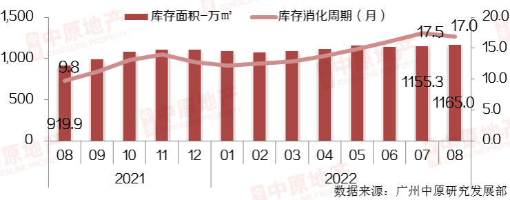 截至8月末,广州全市库存量1165万平方米,去化周期17个月,去化周期对比上个月轻微回落,但仍处于近一年高位,说明目前市场上供应量相对充足,部分区域存在“供大于求”现象。