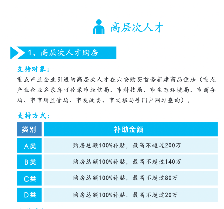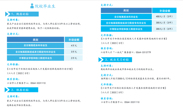 对于重点企业引进的院校毕业生,与用人单位签订3年及以上劳务合同,在六安买首套新房,给予一次性的购房补贴。本科生补助4万元,高职或者专科生补助3万元,中职和技校毕业生补助2万元。在六安租房,本科生补助400元/月(共计3年),高职或者专科生补助300元/月(共计3年),中职和技校毕业生补助300元/月(共计3年)。