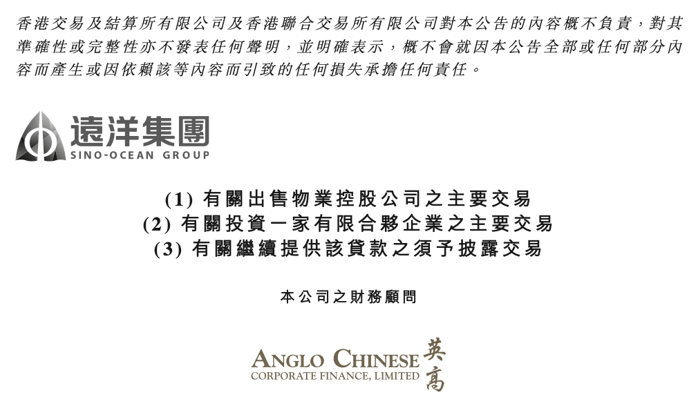 同日,远洋集团发布公告称,该公司计划将出售物业控股公司,即出售持有北京天江通睿置业有限公司(简称“北京天江通睿置业”)99.9%股权的崇高发展有限公司全部已发行股本,以及北京天江通睿置业余下0.1%的股权。