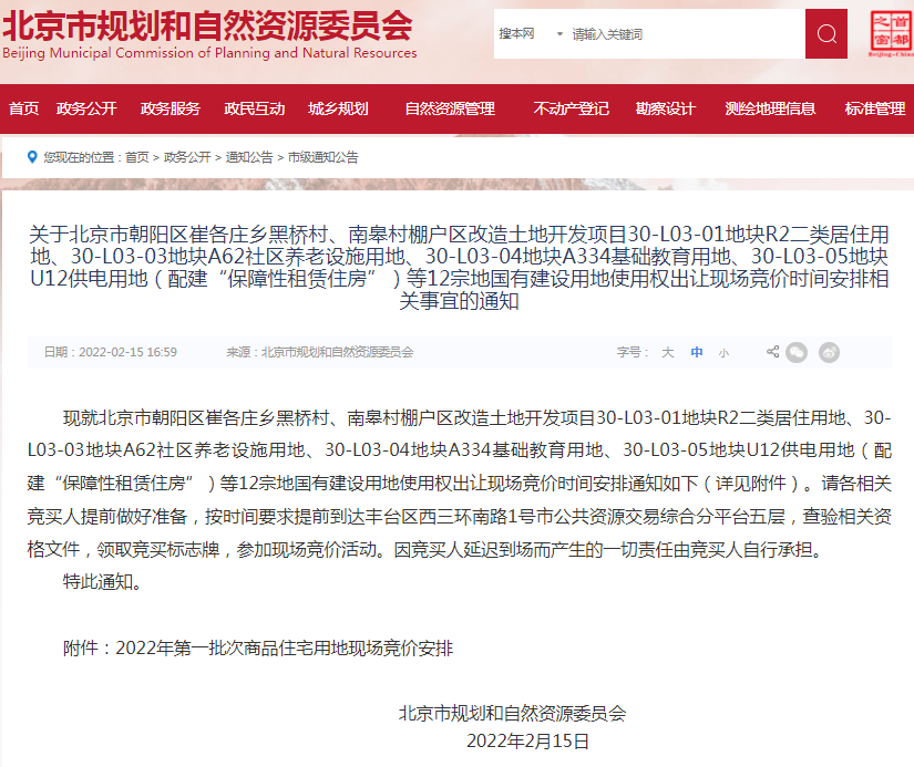【环球网房产报道】2月16日,北京市规划和自然资源委员会消息,2022年排名前列批次集中供地报名截止,12宗商品住宅用地进入现场竞价。