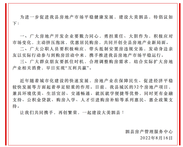 《倡议书》显示,近年随着城市化建设的快速发展,房地产业在保障民生、促进经济平稳较快发展等方面起着举足轻重的作用。目前,泗县城区的32个房地产项目,兼具环境优美、生活宜居、交通畅通、就医就学便捷等优势,同时更有金融支持、公积金贷款、购房入学、人才引进购房补贴等系列惠民、惠企政策支持。
