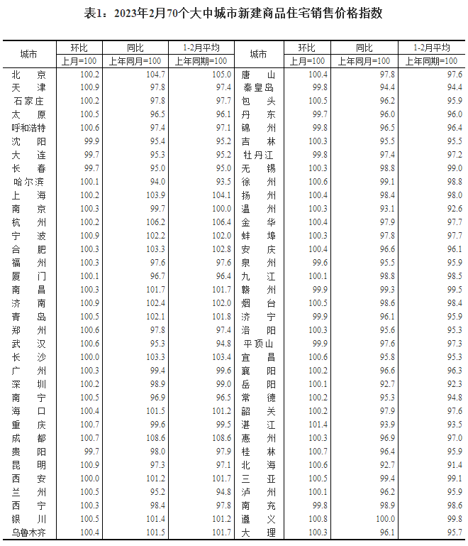 按照国家统计局数据,2023年2月,70个大中城市中,新建商品住宅上涨城市数量55个,较1月增加19城;持平城市2个,较1月增加1城;下跌城市13个,较1月减少20城。