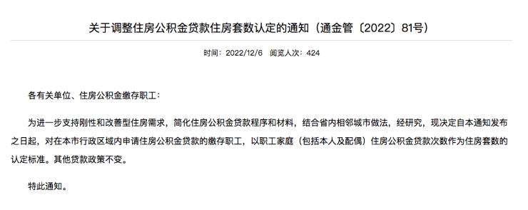 《通知》显示,为进一步支持刚性和改善型住房需求,简化住房公积金贷款程序和材料,结合省内相邻城市做法,经研究,现决定自本通知发布之日起,对在本市行政区域内申请住房公积金贷款的缴存职工,以职工家庭(包括本人及配偶)住房公积金贷款次数作为住房套数的认定标准。其他贷款政策不变。