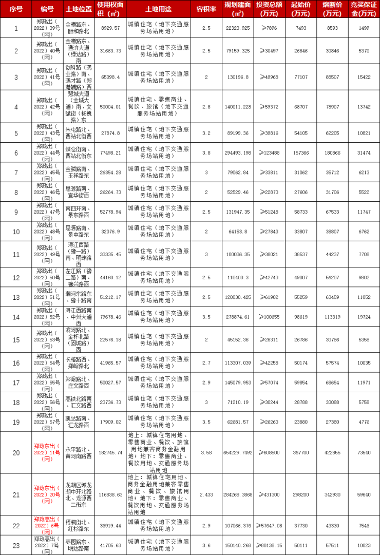 郑政高出〔2022〕6号地块位于梧桐街北、红杉路东,规划用途城镇住宅(地下交通服务场站用地),使用权面积36919.44平方米,起始总价37730万元,熔断价43330万元。