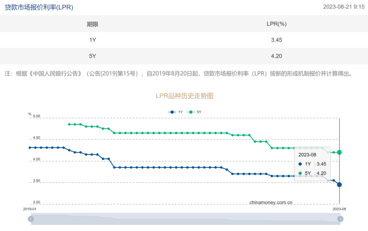 央广网北京8月21日消息(记者 冯方)8月21日,中国人民银行授权全国银行间同业拆借中心公布2023年8月21日贷款市场报价利率(LPR)。其中,1年期LPR为3.45%,较此前下降10个基点;5年期以上LPR为4.2%,维持不变。