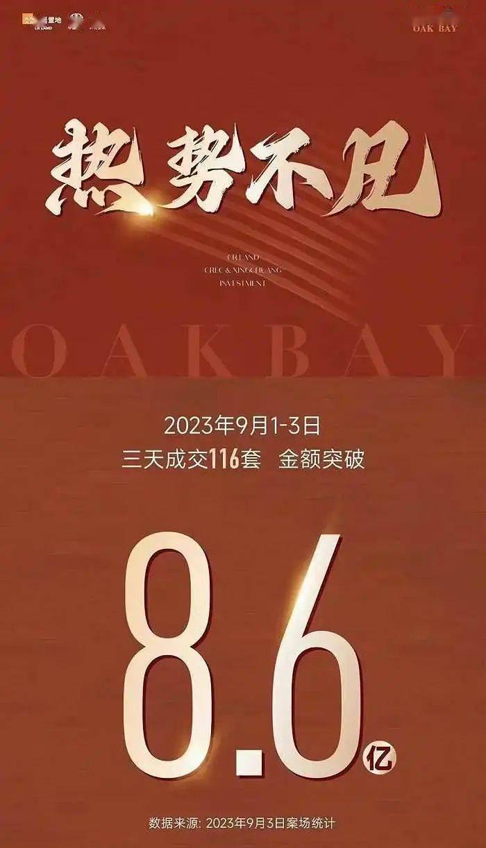 另外,华润置地橡树湾项目也发布海报称,2023年9月1日-3日三天成交116套,金额突破8.6亿。