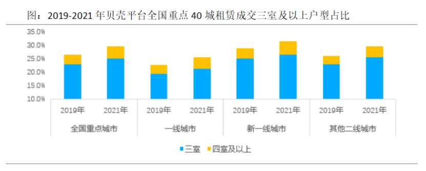 根据贝壳研究院数据,2021年全国重点40城租赁成交房源中,三室及以上的成交占比达到29.6%,相比于2019年增加了5.8个百分点,其中三室占比增加了4.5个百分点。