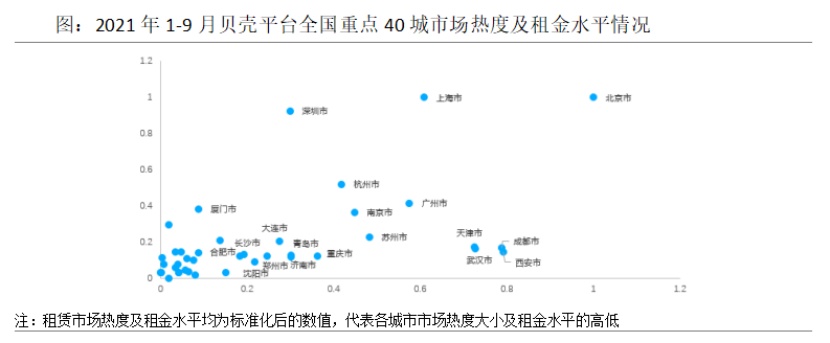 从季度来看,除了上海、南京、武汉和郑州市三季度成交环比小幅下降外,其余城市市场热度均保持升温趋势。全国重点40城的租赁需求主要是外来流动人口以及本地的换租需求,今年1-9月市场热度较高的20个城市中,17个为超大及特大城市,流动人口进一步向大城市聚集,带动租赁市场活跃度提升。