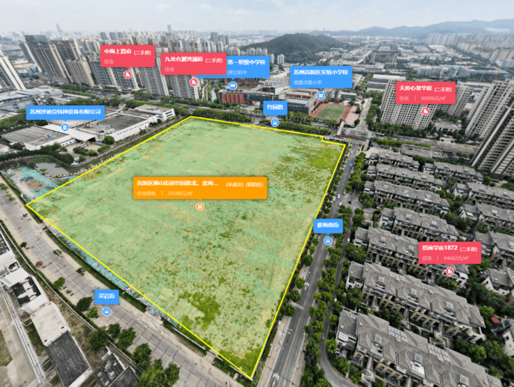 本批次地块中,成交总价最高也是溢价率第二的地块为编号为苏地2022-WG-34号的地块,该地块规划为住宅地块,位于高新区狮山街道竹园路北、淮海南街东。