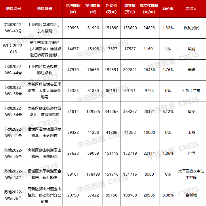 中国指数研究院分析称,本批次地块溢价成交地块均为位于高新区、工业园区的热门板块地块,其中苏地2022-WG-36号地块为溢价率最高且成交楼板价最高的地块。