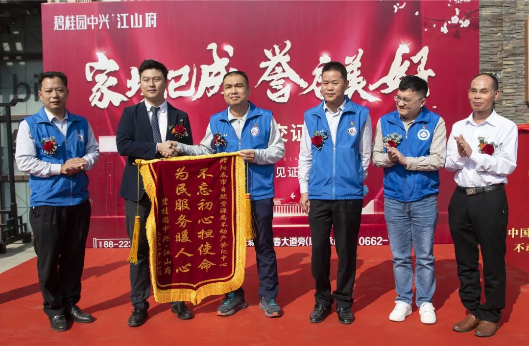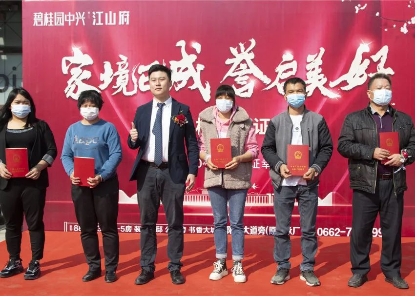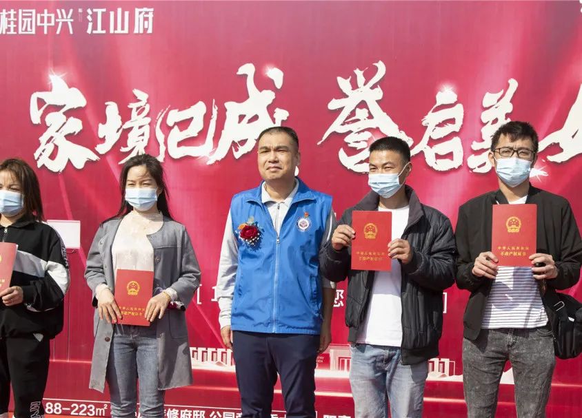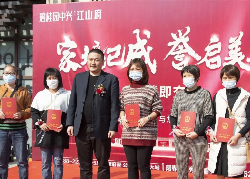 由阳春市不动产登记中心主任朱伟胜先生、碧桂园中兴·江山府(碧桂园城央花园)项目总经理张正浩先生、中兴房地产开发有限公司副总经理严小龙先生,分批为业主发放了不动产权证,并与业主合影,送上祝福。