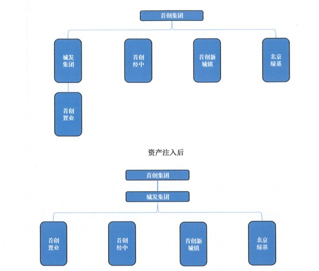 根据资产注入方案,首创集团拟通过换股方式,将其持有的首创经中、首创新城镇和北京绿基的股权注入首创置业全资股东首创城发,首创城发以自身股权为对价进行支付。