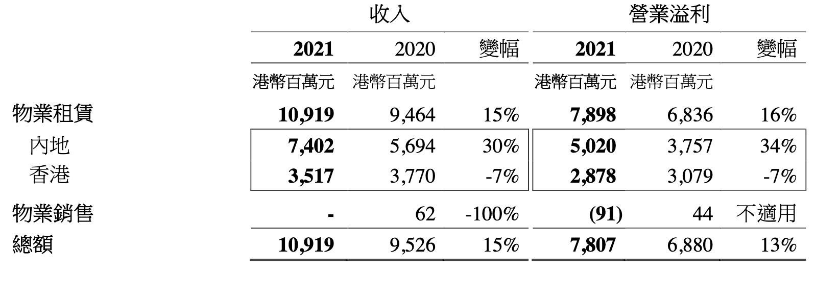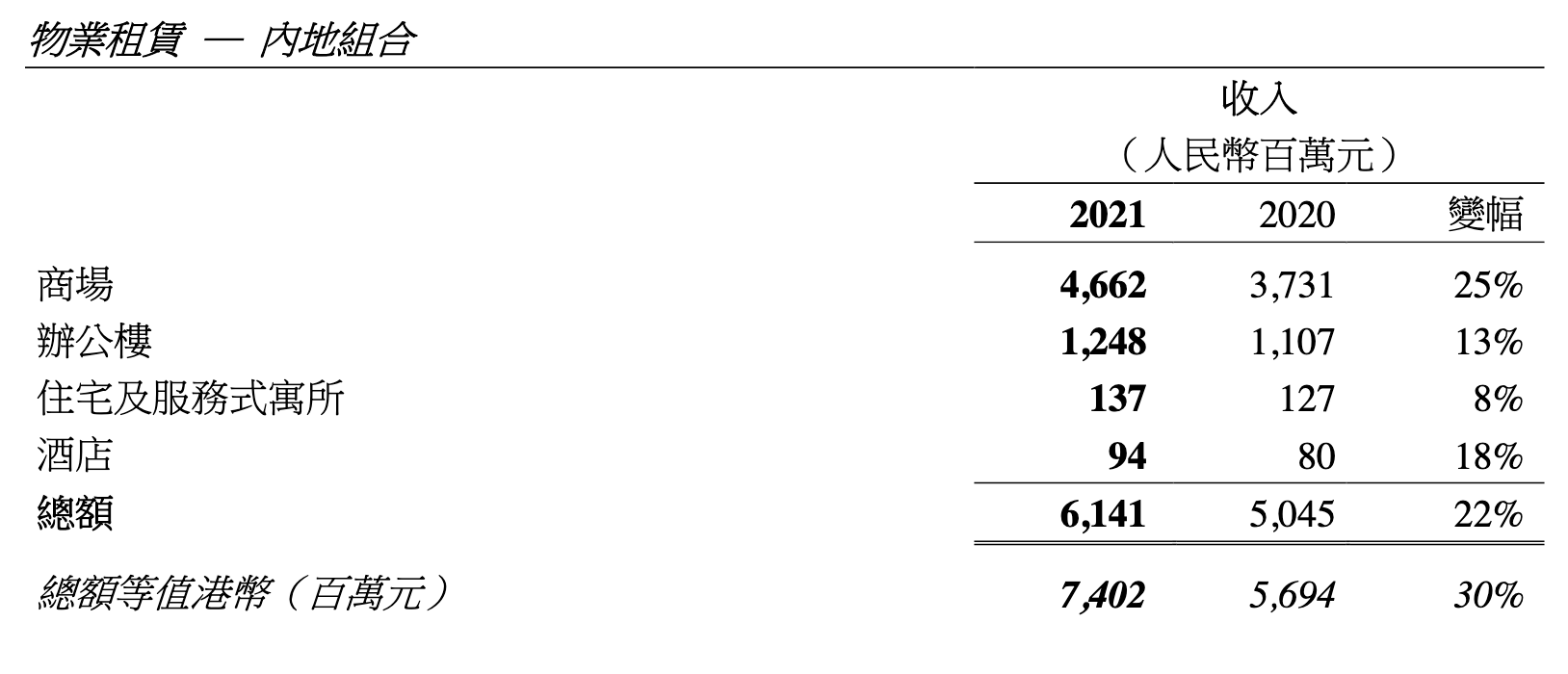 收入方面,受内地高端商场的强劲表现带动,恒隆集团2021年内地物业租赁收入同比大涨30%,录得74.02亿港元;香港物业租赁35.17亿港元,同比减少7%。其中,内地商场租赁收入46.62亿港元,同比增长25%;办公楼租赁收入12.48亿港元,同比增长13%;住宅及服务式寓所租赁收入1.37亿港元,同比增长8%;酒店租赁收入0.94亿港元,同比增长18%。