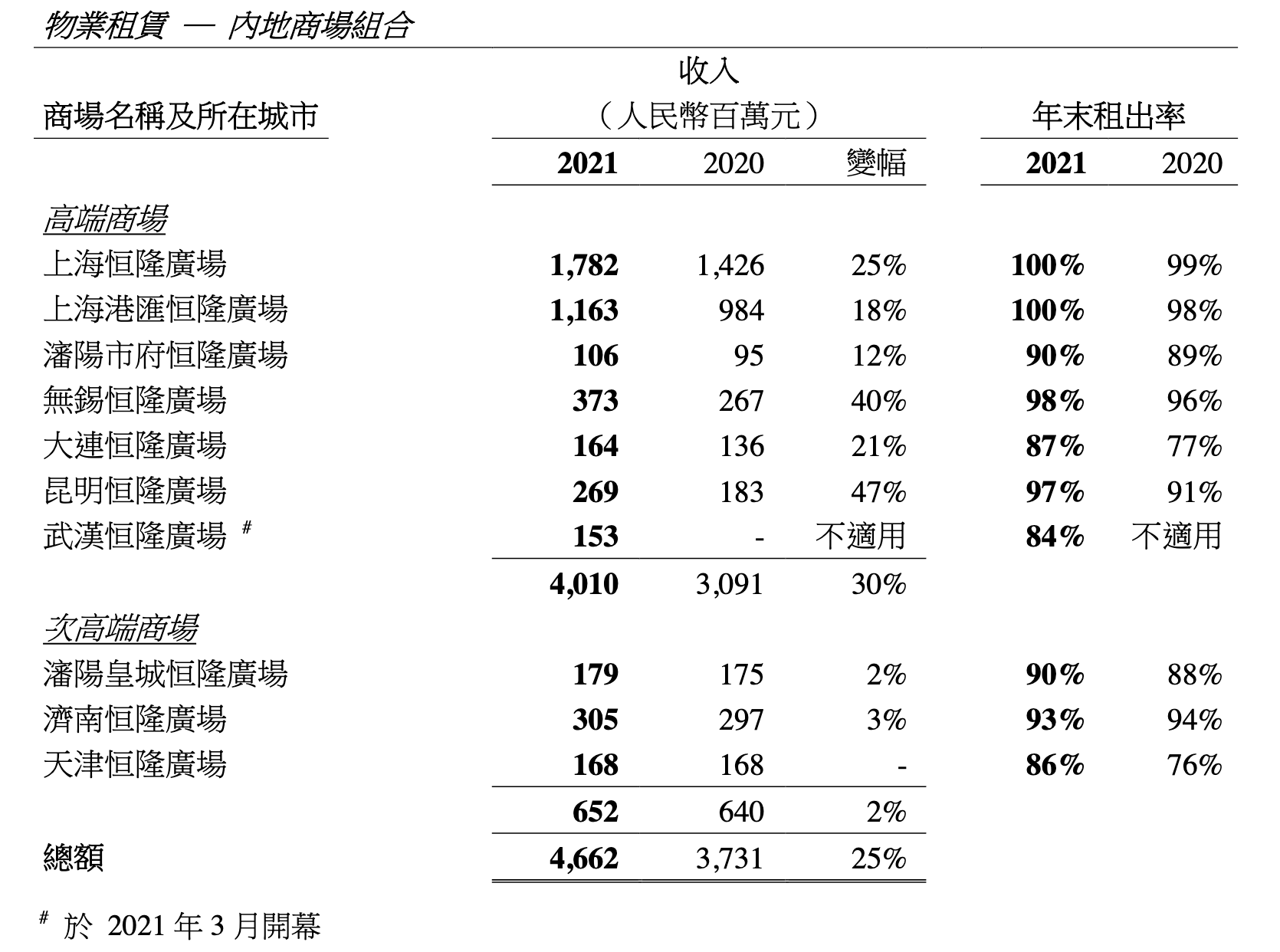 值得一提的是,于2021年3月开业的武汉恒隆广场表现超出预期,在开业不足10个月的营运期内,收入达到1.53亿元,租户销售额接近10亿元,租出率达84%。恒隆集团及恒隆地产董事长陈启宗在业绩会上表示,武汉恒隆在未来两年会成为内地除上海以外较大的商场之一。