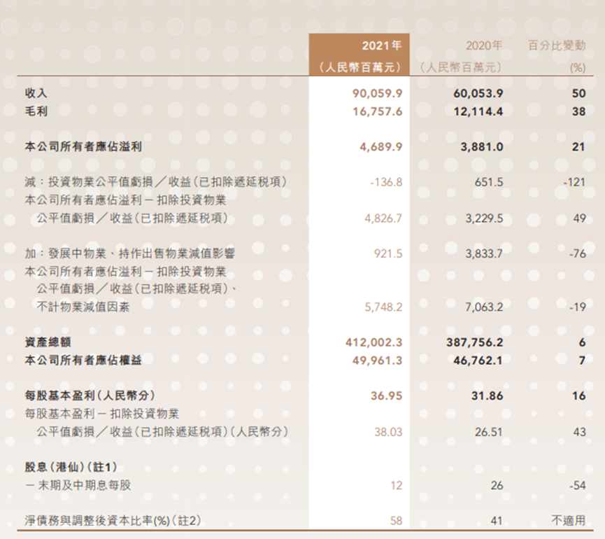 报告显示,中国金茂2021年营业收入约900.6亿元,同比上升50%;毛利约167.58亿元,同比上升38%;归母净利润约46.89亿元,同比上升21%。