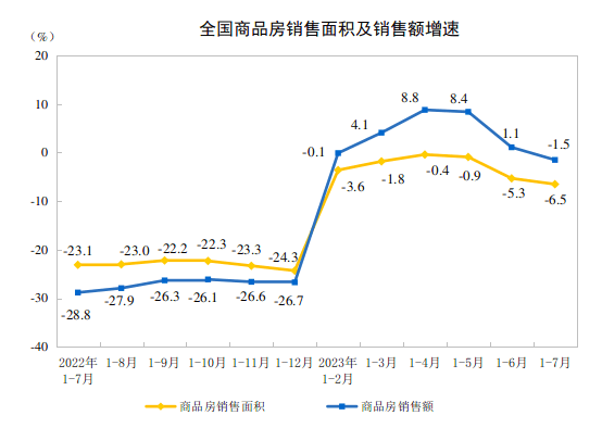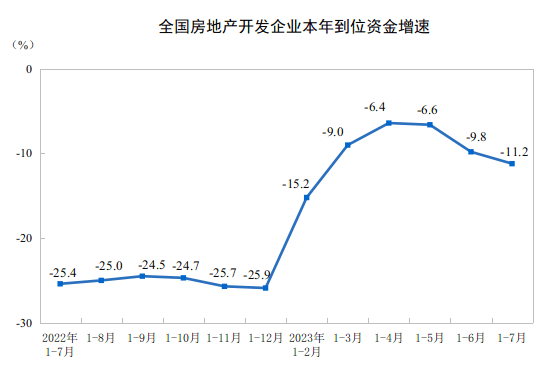 与此同时,国家统计局数据显示,1-7月份,房地产开发企业房屋施工面积约79.97亿平方米,同比下降6.8%,其中住宅施工面积约56.30亿平方米,下降7.1%;房屋新开工面积约5.67亿平方米,下降24.5%,其中住宅新开工面积约4.15亿平方米,下降25.0%;房屋竣工面积约3.84亿平方米,增长20.5%,其中住宅竣工面积约2.80亿平方米,增长20.8%。