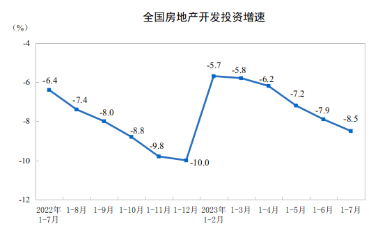 房地产开发投资的下降幅度再次扩大。国家统计局数据显示,1-7月份,全国房地产开发投资67717亿元,同比下降8.5%;其中,住宅投资51485亿元,下降7.6%。