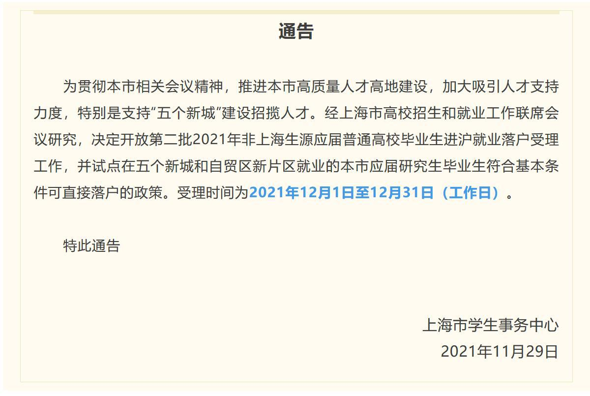 【环球网房产报道】11月29日,上海市学生事务中心发布通告。通告显示,决定开放第二批2021年非上海生源应届普通高校毕业生进沪就业落户受理工作,并试点在五个新城(嘉定、青浦、松江、奉贤、南汇)和自贸区新片区就业的本市应届研究生毕业生符合基本条件可直接落户的政策。