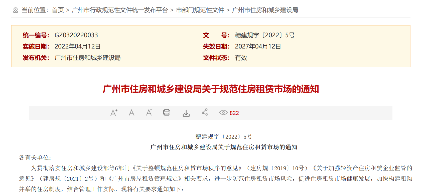 央广网北京4月13日消息 为贯彻落实住房和城乡建设部等6部门《关于整顿规范住房租赁市场秩序的意见》(建房规〔2019〕10号)《关于加强轻资产住房租赁企业监管的意见》(建房规〔2021〕2号)和《广州市房屋租赁管理规定》相关要求,进一步防范住房租赁市场风险,促进住房租赁市场健康发展,加快构建租购并举的住房制度,4月12日《广州市住房和城乡建设局关于规范住房租赁市场的通知》(以下简称《通知》)。《通知》自4月12日起施行,有效期5年。