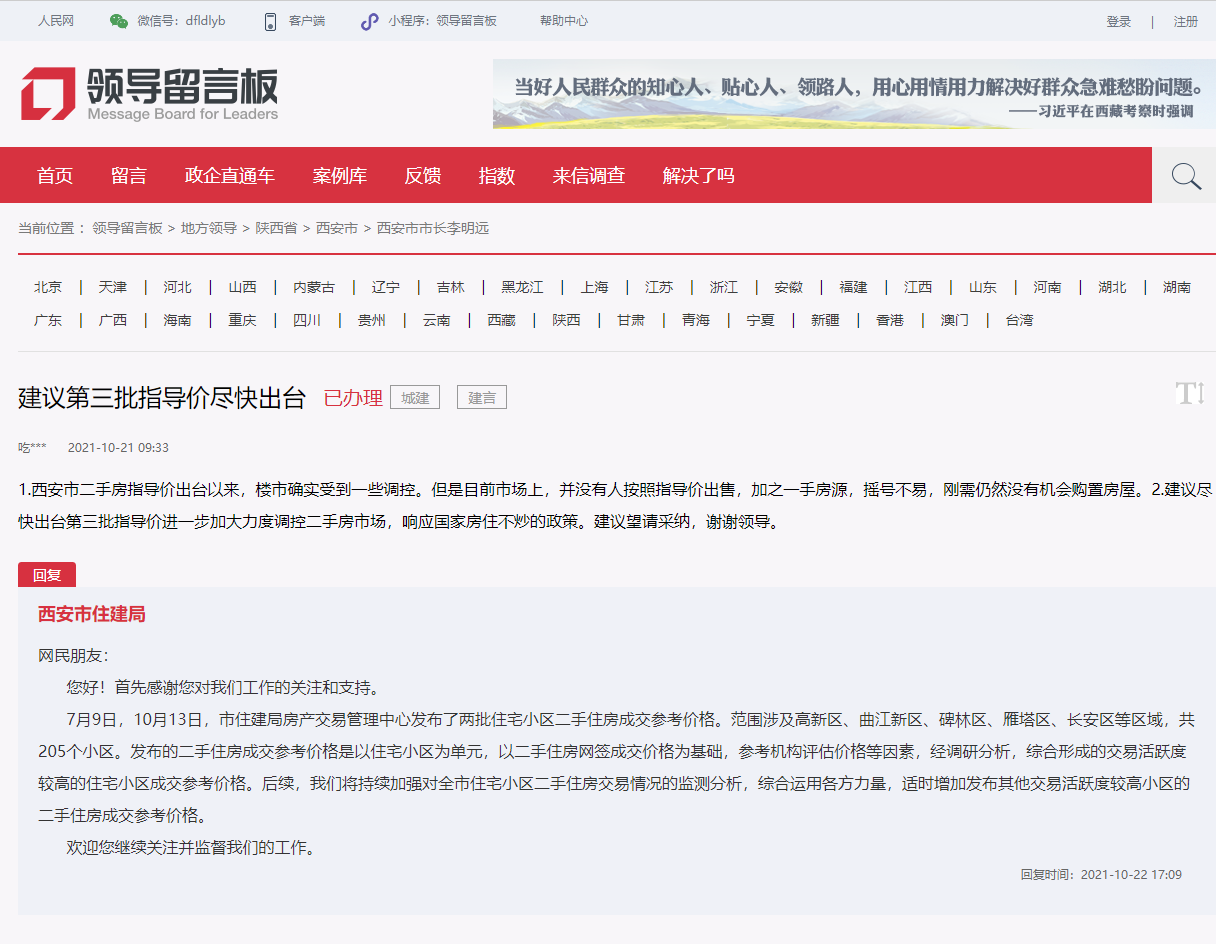 西安市住建局回复: 发布的二手住房成交参考价格是以住宅小区为单元,以二手住房网签成交价格为基础,参考机构评估价格等因素,经调研分析,综合形成的交易活跃度较高的住宅小区成交参考价格。后续,我们将持续加强对全市住宅小区二手住房交易情况的监测分析,综合运用各方力量,适时增加发布其他交易活跃度较高小区的二手住房成交参考价格。