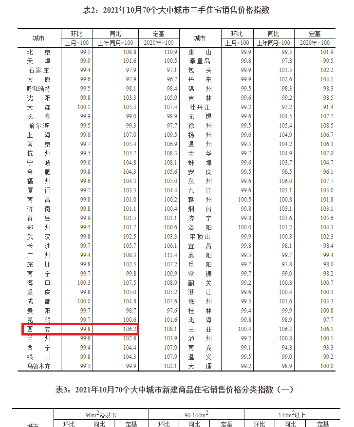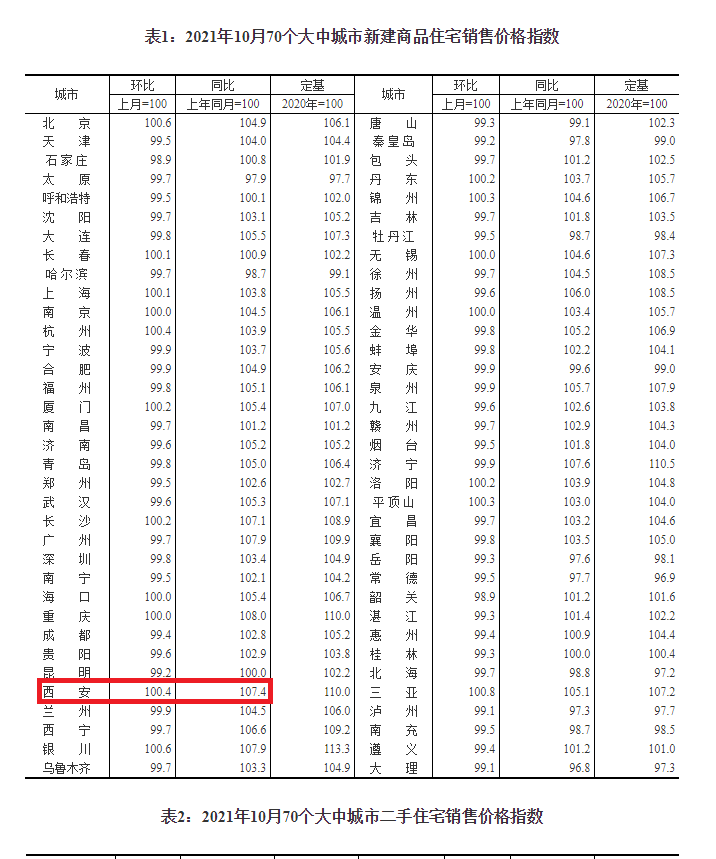 【环球网房产报道】今日(11月15日),国家统计局发布了《2021年10月份70个大中城市商品住宅销售价格变动情况》,其中中数据显示:西安10月新房环比上涨0.4%(9月0.6%),二手房下跌0.2%(9月0.2%)。