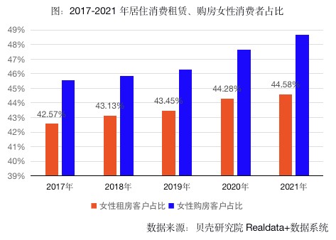 3月7日,贝壳研究院发布的《女性居住消费调查报告2022》显示,从租、购消费趋势看,女性消费者占比连续5年呈上升趋势。