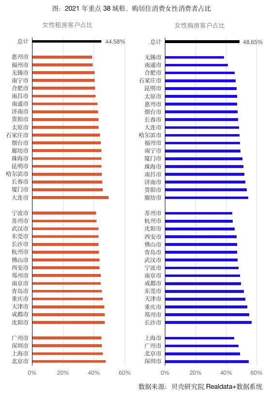 不过,不同城市之间存在差异,个别城市女性居住消费潜力不断释放,女性消费者占比提升较快。
